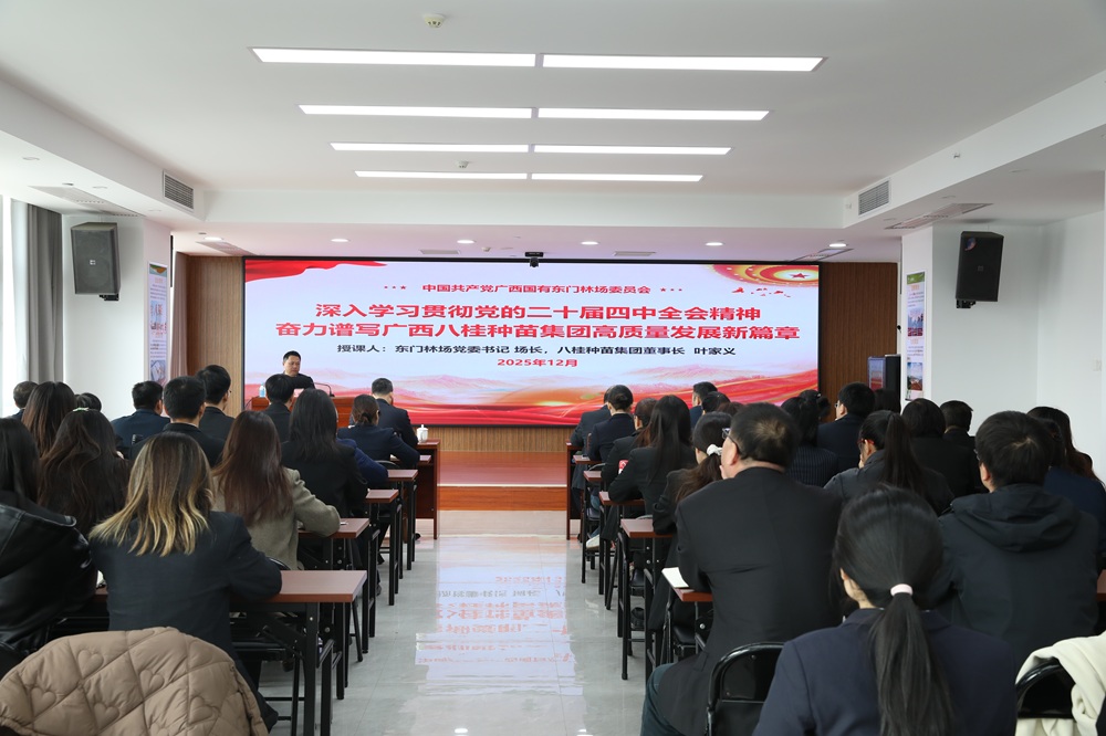 2025年12月26日,八桂種苗集團(tuán)召開深入學(xué)習(xí)貫徹黨的二十屆四中全會(huì)精神宣講會(huì)。東門林場(chǎng)黨委書記、場(chǎng)長(zhǎng),八桂種苗集團(tuán)董事長(zhǎng)葉家義到集團(tuán)作專題宣講輔導(dǎo)。集團(tuán)黨支部書記、總經(jīng)理詹定舉主持會(huì)議,集團(tuán)經(jīng)營(yíng)班子成員、職能部門全體人員及南寧片區(qū)組培廠負(fù)責(zé)人參加宣講會(huì)。
