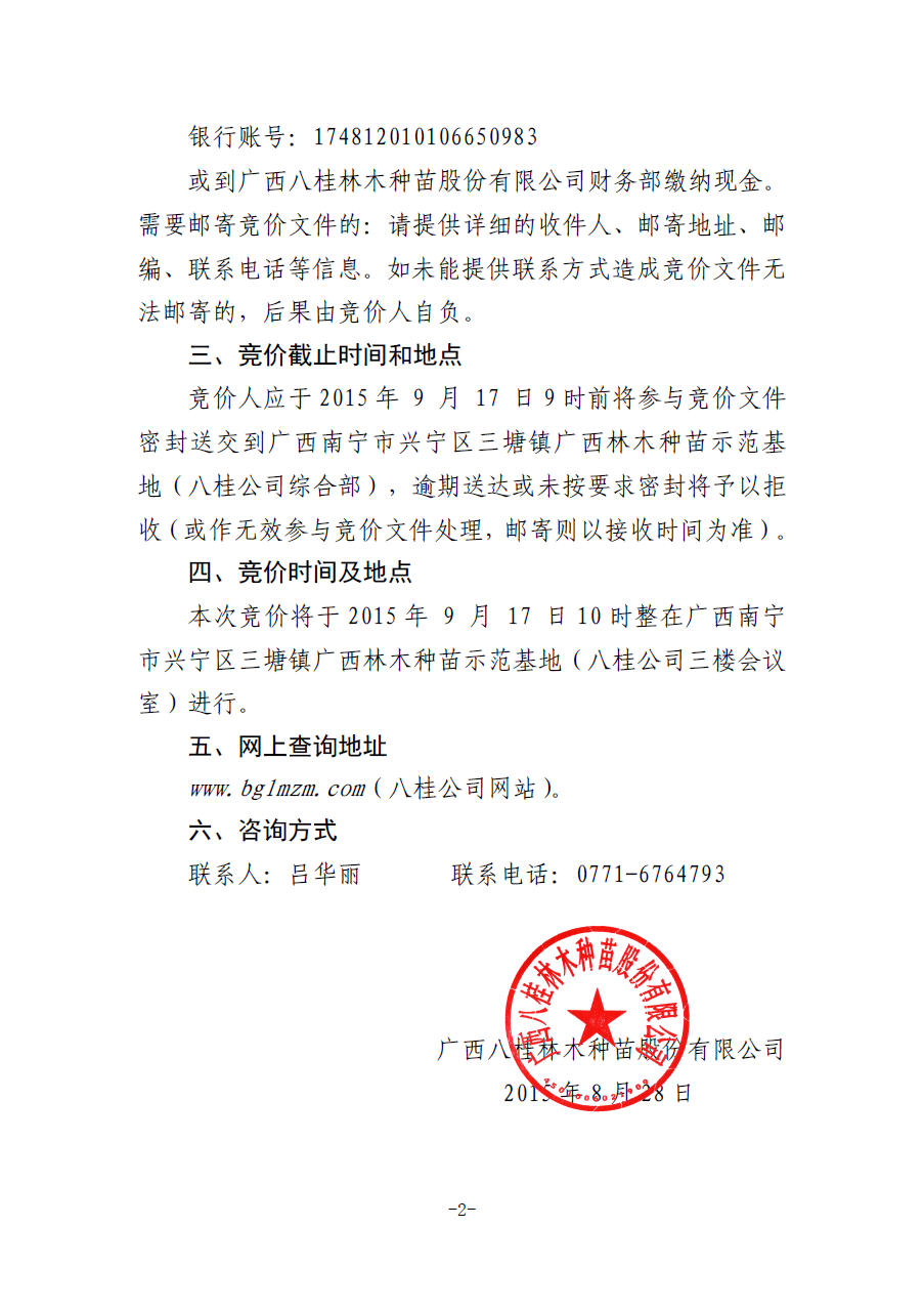 2. 競價文件發(fā)售地點(diǎn):廣西八桂林木種苗股份有限公司財務(wù)部[南寧市興寧區(qū)昆侖大道廣西林木種苗示范基地內(nèi)(壯鷹加油站往南寧方向100米)]。